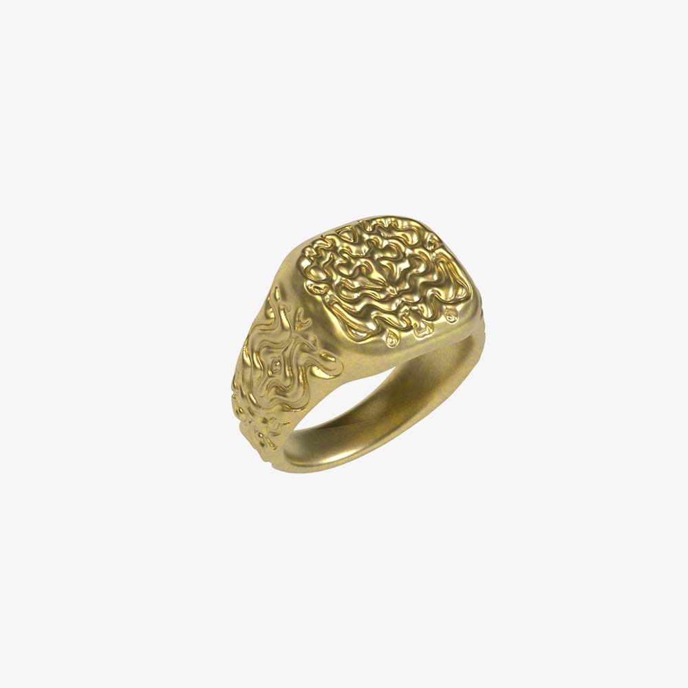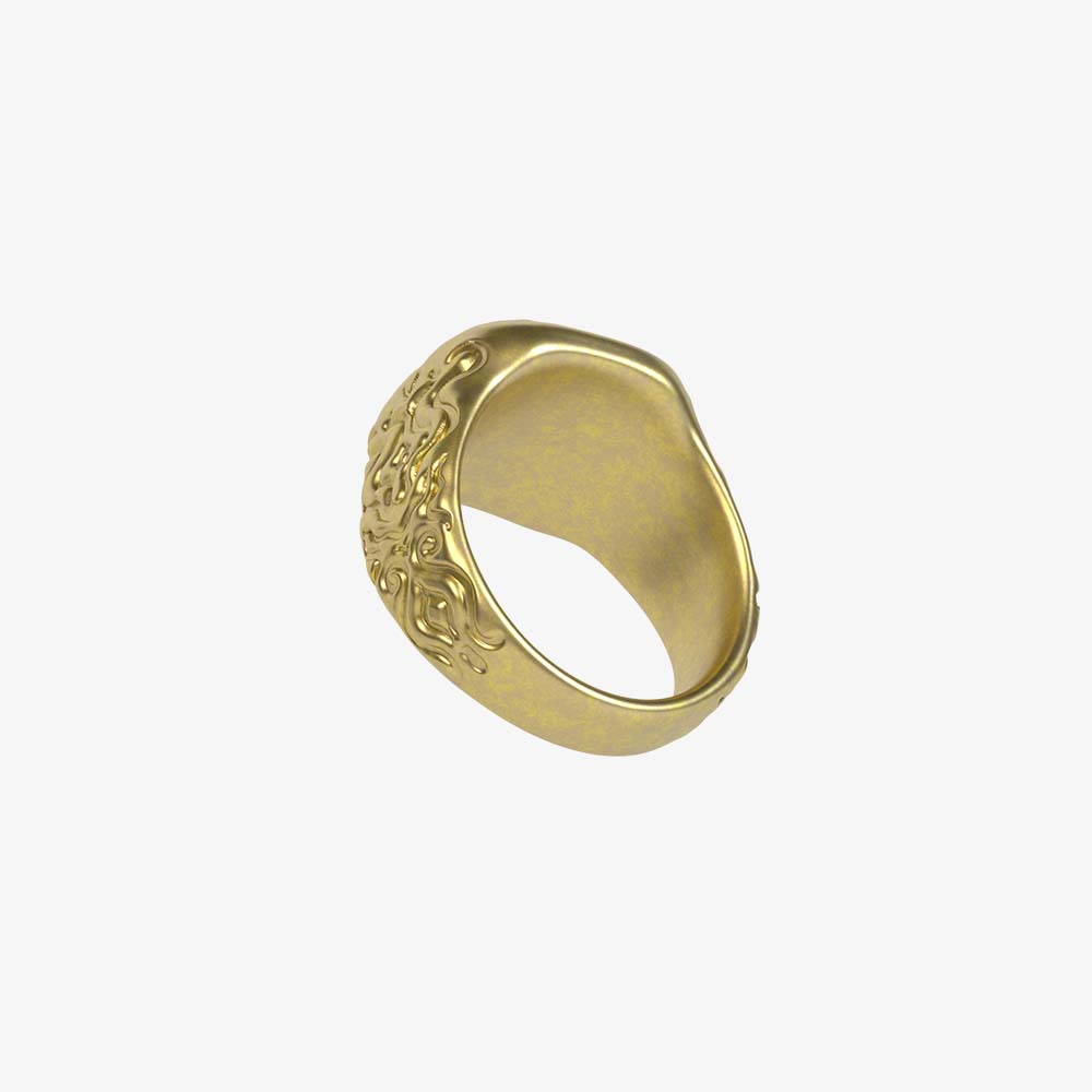 Mosiężny sygnet ze wzorami, zdobiony nie tylko na górnej powierzchni, ale również delikatnymi zdobieniami biegnącymi po bokach pierścienia. Dla wszystkich tych, którzy cenią detale.